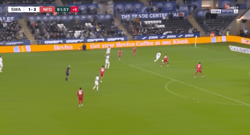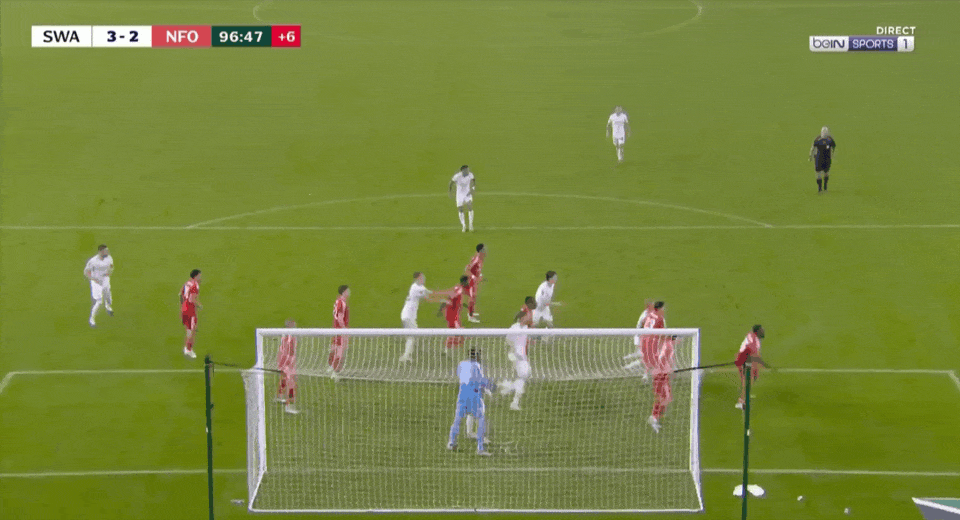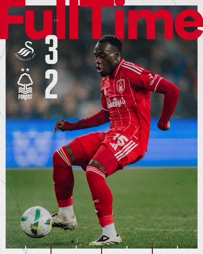 在随后补时临近尾声的读秒阶段,加尔布雷斯远射击中立柱,皮球反弹来到伯吉斯脚下,后者果断凌空起脚抽射扳平比分,斯旺西在5分钟内连进两球,将比分改写为3-2,成功淘汰英超球队诺丁汉森林。