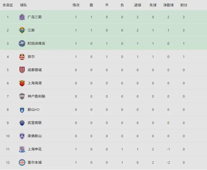 北京时间9月16日亚冠日报,亚冠精英联赛首轮比赛正式打响!客场作战的中超劲旅上海申花队1-2遭江原FC 逆转;广岛三箭则客场2-0完胜澳超球队墨尔本城;首尔FC客场1-1战平日本劲旅町田泽维亚。这3场比赛结束,亚冠积分榜的最新排名也已经更新,中超3队均是0分(蓉城队、海港队还未赛)。